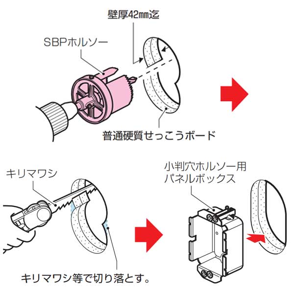 ●せっこうボード(強化・硬質を含む)にボックス穴をホルソーであける工法に最適な、φ56専用SBPホルソーで す。(刃の着脱・交換はできません。)