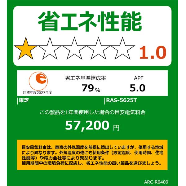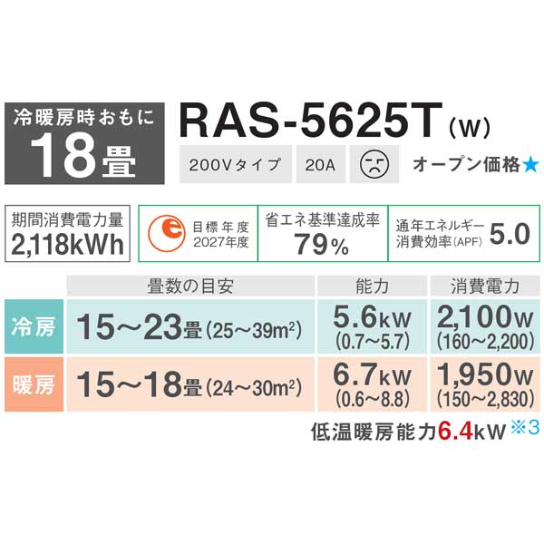 (JIS C 9612:2013)79%/5.0 【冷房】畳数のめやす 15~23畳(25~39m2) 【冷房】能力(kW) 5.6(0.7~5.7) 【冷房】消費電力(W) 2,100(160~2,200) 【暖房】畳数のめやす 15~18畳(24~30m2) 【暖房】能力(kW) 6.7(0.6~8.8) 【暖房】消費電力(W) 1,950(150~2,830) 低温暖房能力 6.4kW外気温2℃時 メーカー保証期間 1年間