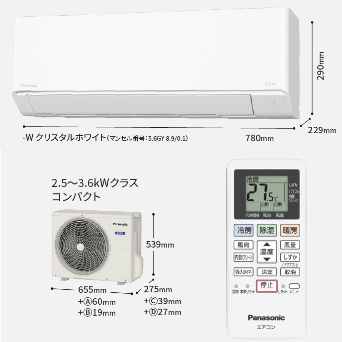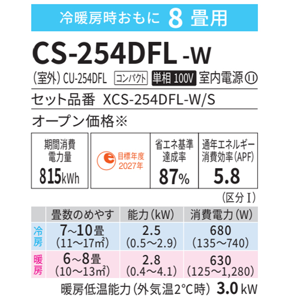 パナソニック ルームエアコン おもに8畳用 CS-254DFL-W エオリア Fシリーズ 2.5kw