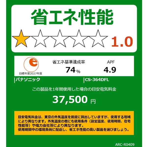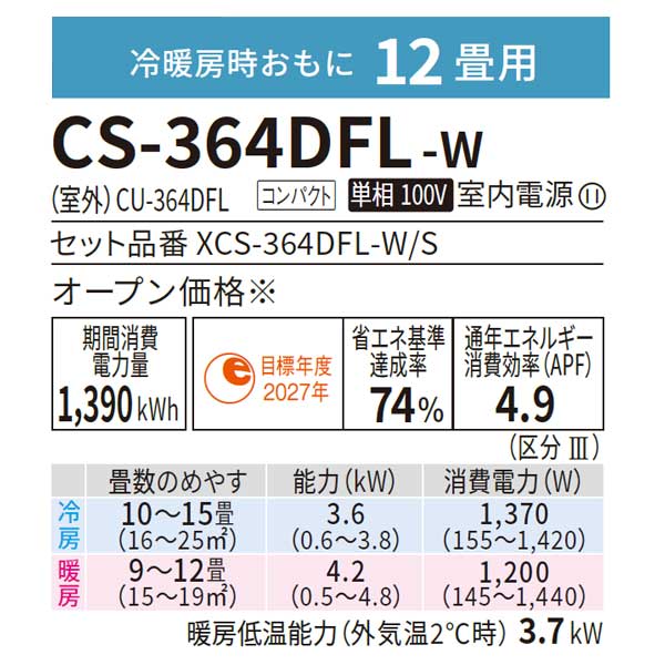 (JIS C 9612:2013)74%/4.9 【冷房】畳数のめやす 10~15畳(16~25m2) 【冷房】能力(kW) 3.6(0.6~3.8) 【冷房】消費電力(W) 1370(145~1420) 【暖房】畳数のめやす 9~12畳(15~19m2) 【暖房】能力(kW) 4.2(0.5~4.8) 【暖房】消費電力(W) 1200(145~1440) 低温暖房能力 3.7kW外気温2℃時 メーカー保証期間 1年間