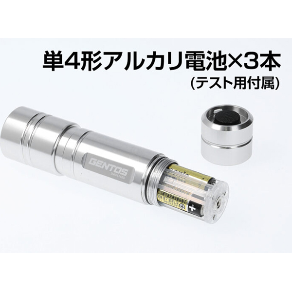 使用光源 高輝度チップタイプ白色×1個 明るさ(約) 260ルーメン(最大時) 光度(約) 4915カンデラ(最大時) 使用電池 単4形アルカリ電池×3本