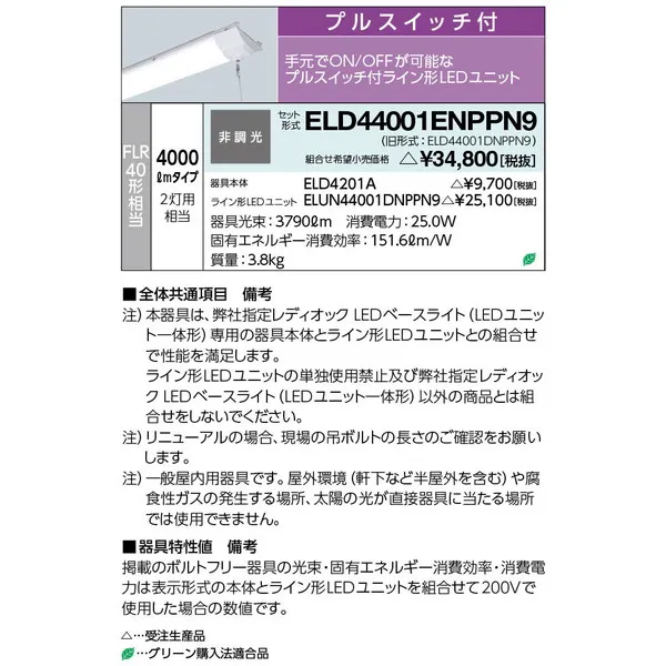 岩崎電気 LEDベースライト 40W形 直付形 昼白色 FLR40形相当 プルスイッチ付 ELD44001ENPPN9