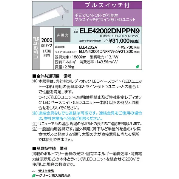 岩崎電気 LEDベースライト 埋込下面開放形 W220 昼白色 FLR40形相当 1灯相当 プルスイッチ付 ELE42002DNPPN9