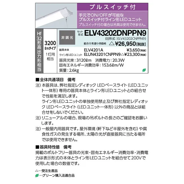 岩崎電気 LEDベースライト 40W形 逆富士形 W230 昼白色 Hf32形高出力形相当プルスイッチ付 ELV43202DNPPN9