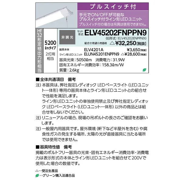 岩崎電気 LEDベースライト 40W形 逆富士形 W230 昼白色 Hf32形定格出力形相当 プルスイッチ付 ELV45202FNPPN9