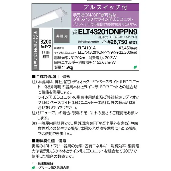 岩崎電気 LEDベースライト 40W形 トラフ形 昼白色 Hf32形高出力形相当プルスイッチ付 ELT43201DNPPN9
