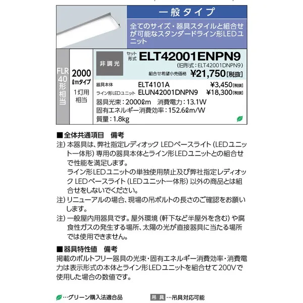 岩崎電気 LEDベースライト 40W形 トラフ形 昼白色 FLT40形相当 ELT42001ENPN9