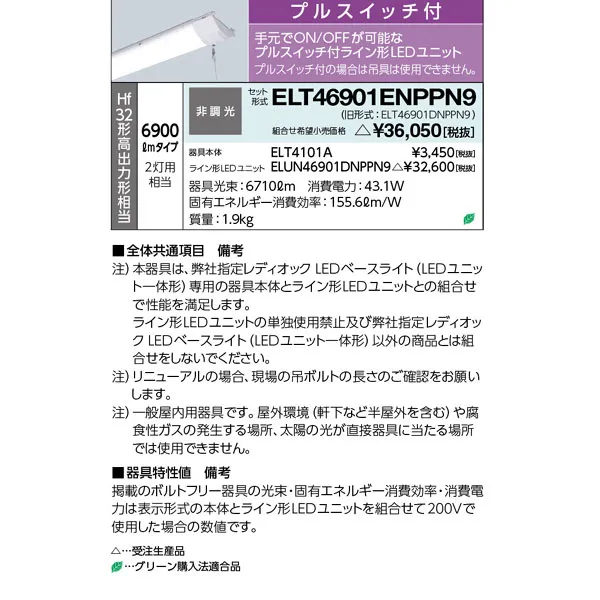 岩崎電気 LEDベースライト 40W形 トラフ形 昼白色Hf32形高出力形相当 プルスイッチ付 ELT46901ENPPN9