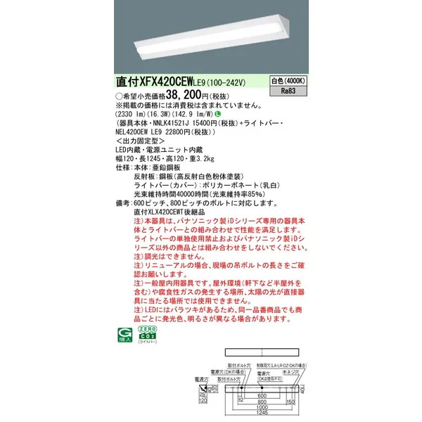 パナソニック iDシリーズ 天井直付型 40形 一体型LEDベースライト コーナーライト XFX420CEWLE9 白色(4000K)