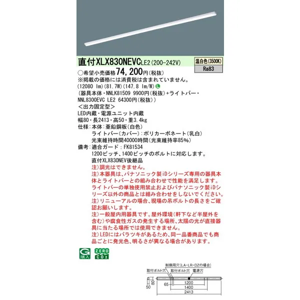パナソニック iDシリーズ 天井直付型 110形 一体型LEDベースライト iスタイル W80 XLX830NEVCLE2 温白色(3500K)