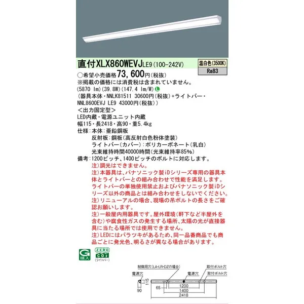 パナソニック iDシリーズ 天井直付型 110形 一体型LEDベースライト ウォールウォッシャ XLX860WEVJLE9 温白色(3500K)