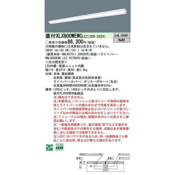 パナソニック iDシリーズ 天井直付型 110形 一体型LEDベースライト ウォールウォッシャ XLX800WEWCLE2 白色(4000K)