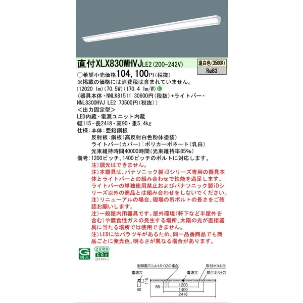 パナソニック iDシリーズ 天井直付型 110形 一体型LEDベースライト ウォールウォッシャ XLX830WHVJLE2 温白色(3500K)