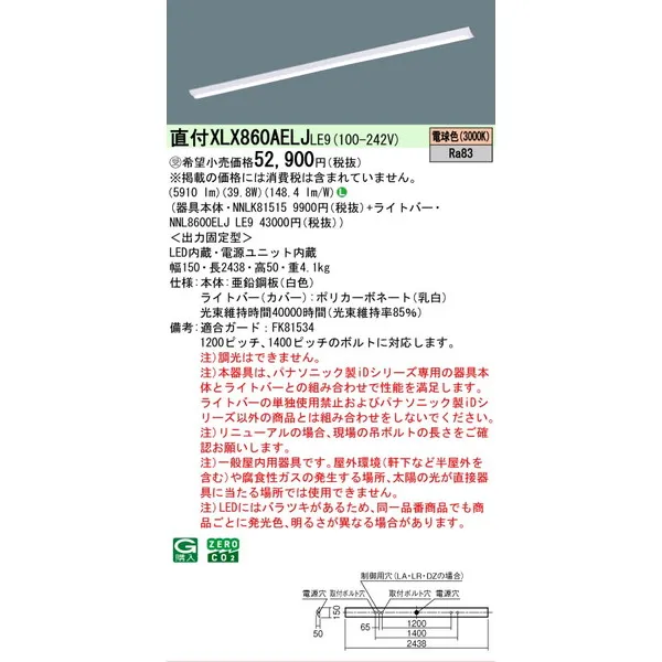 パナソニック iDシリーズ 天井直付型 110形 一体型LEDベースライト Dスタイル W150 富士型 XLX860AELJLE9 電球色(3000K)