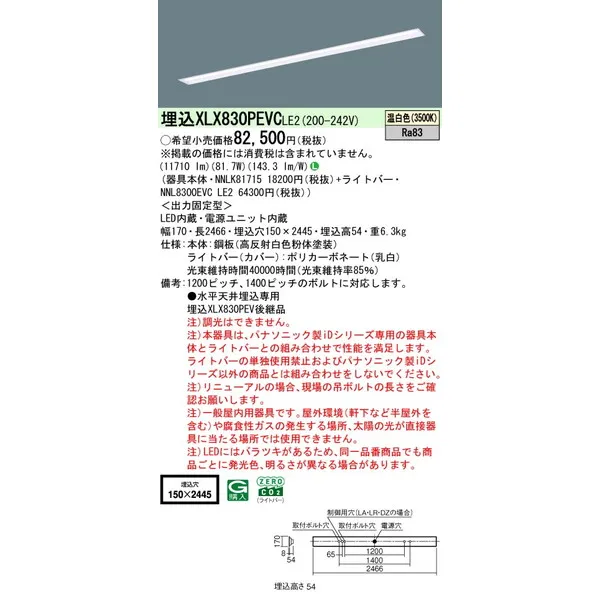 パナソニック iDシリーズ 天井埋込型 110形 一体型LEDベースライト 下面開放型 W150 XLX830PEVCLE2 温白色(3500K)