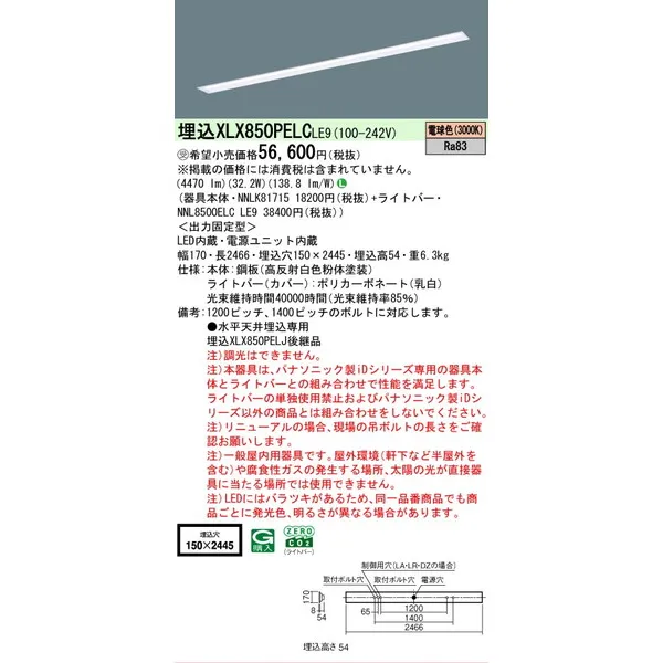 パナソニック iDシリーズ 天井埋込型 110形 一体型LEDベースライト 下面開放型 W150 XLX850PELCLE9 電球色(3000K)