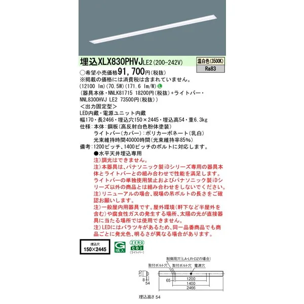 パナソニック iDシリーズ 天井埋込型 110形 一体型LEDベースライト 下面開放型 W150 XLX830PHVJLE2 温白色(3500K)