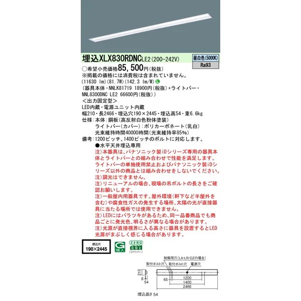 パナソニック iDシリーズ 天井埋込型 110形 一体型LEDベースライト 下面開放型 W190 XLX830RDNCLE2 昼白色(5000K)