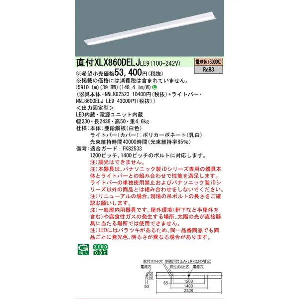 パナソニック iDシリーズ 天井直付型 110形 一体型LEDベースライト Dスタイル W230 富士型 XLX860DEWJLE9 白色(4000K)