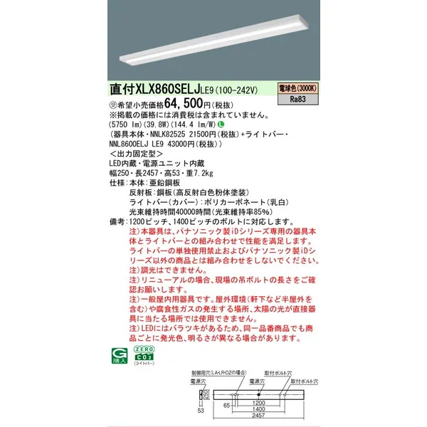パナソニック iDシリーズ 天井直付型 110形 一体型LEDベースライト スリムベース XLX860SELJLE9 電球色(3000K)