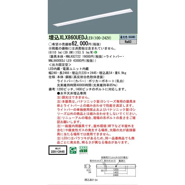 パナソニック iDシリーズ 天井埋込型 110形 一体型LEDベースライト 下面開放型 W220 XLX860UEDJLE9 昼光色(6500K)