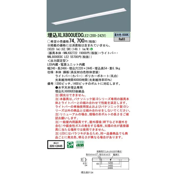 パナソニック iDシリーズ 天井埋込型 110形 一体型LEDベースライト 下面開放型 W220 XLX800UEDCLE2 昼光色(6500K)