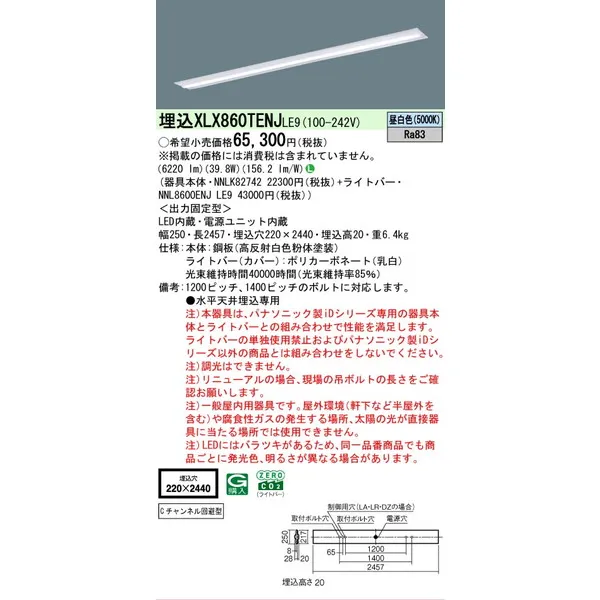 パナソニック iDシリーズ 天井埋込型 110形 一体型LEDベースライト 下面開放型 W220 XLX860TENJLE9 昼白色(5000K)