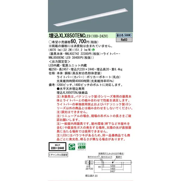 パナソニック iDシリーズ 天井埋込型 110形 一体型LEDベースライト 下面開放型 W220 XLX850TENCLE9 昼白色(5000K)