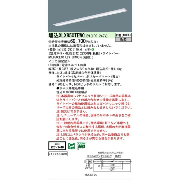 パナソニック iDシリーズ 天井埋込型 110形 一体型LEDベースライト 下面開放型 W220 XLX850TEWCLE9 白色(4000K)
