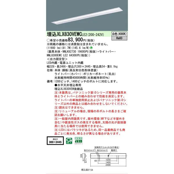 パナソニック iDシリーズ 天井埋込型 110形 一体型LEDベースライト 下面開放型 W300 XLX830VEWCLE2 白色(4000K)