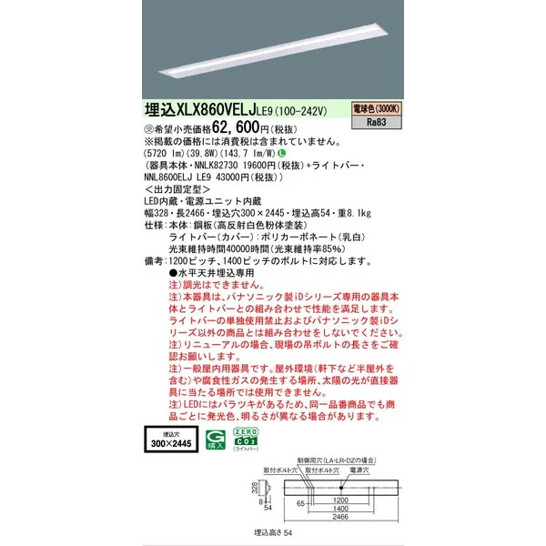 パナソニック iDシリーズ 天井埋込型 110形 一体型LEDベースライト 下面開放型 W300 XLX860VELJLE9 電球色(3000K)