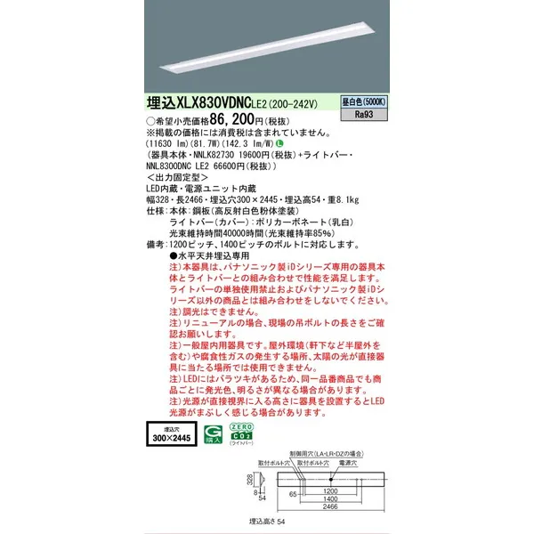 パナソニック iDシリーズ 天井埋込型 110形 一体型LEDベースライト 下面開放型 W300 XLX830VDNCLE2 昼白色(5000K)