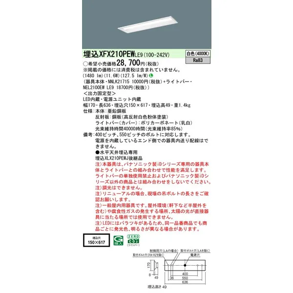 パナソニック iDシリーズ 天井埋込型 20形 一体型LEDベースライト 下面開放型 W150 XFX210PEWLE9 白色(4000K)