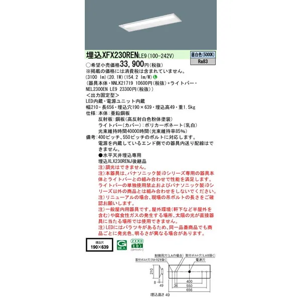 パナソニック iDシリーズ 天井埋込型 20形 一体型LEDベースライト 下面開放型 W190 XFX230RENLE9 昼白色(5000K)