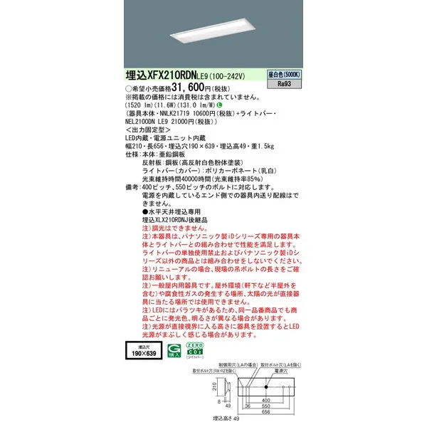 パナソニック iDシリーズ 天井埋込型 20形 一体型LEDベースライト 下面開放型 W190 XFX210RDNLE9 昼白色(5000K)