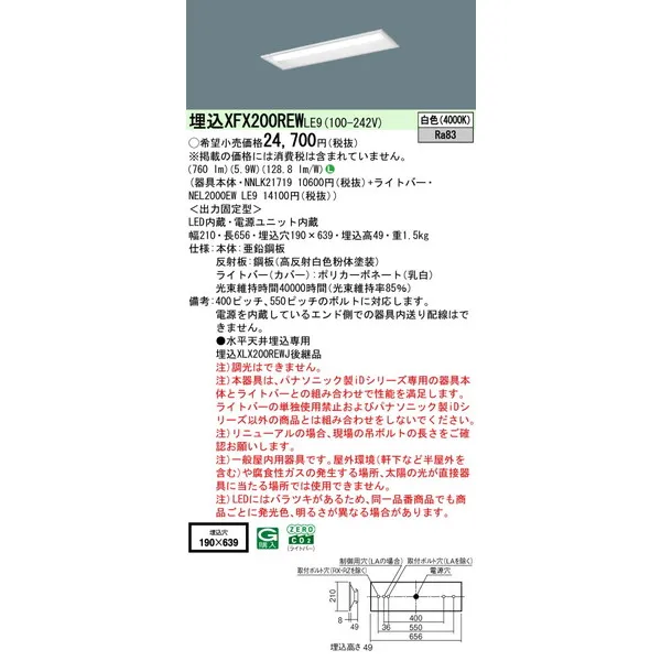 パナソニック iDシリーズ 天井埋込型 20形 一体型LEDベースライト 下面開放型 W190 XFX200REWLE9 白色(4000K)