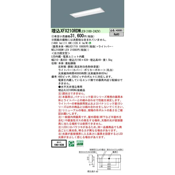 パナソニック iDシリーズ 天井埋込型 20形 一体型LEDベースライト 下面開放型 W190 XFX210RDWLE9 白色(4000K)
