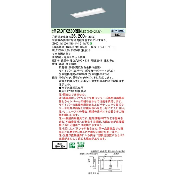 パナソニック iDシリーズ 天井埋込型 20形 一体型LEDベースライト 下面開放型 W190 XFX230RDNLE9 昼白色(5000K)
