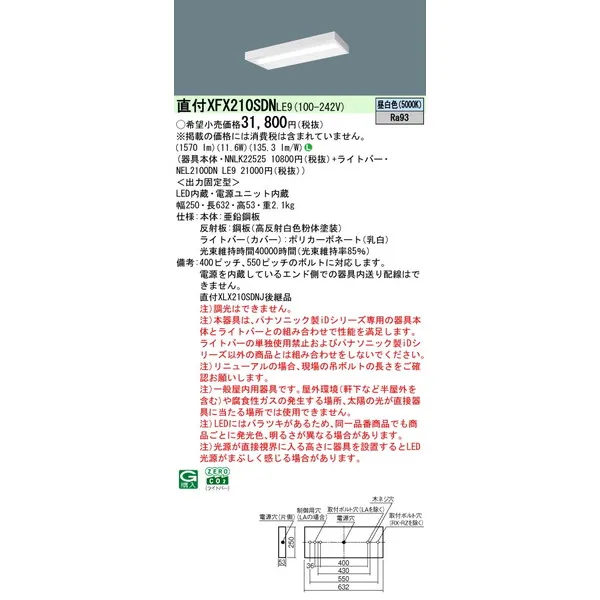パナソニック iDシリーズ 天井直付型 20形 一体型LEDベースライト スリムベース XFX210SDNLE9 昼白色(5000K)