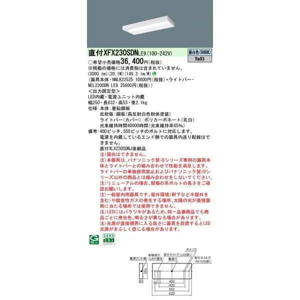 パナソニック iDシリーズ 天井直付型 20形 一体型LEDベースライト スリムベース XFX230SDNLE9 昼白色(5000K)