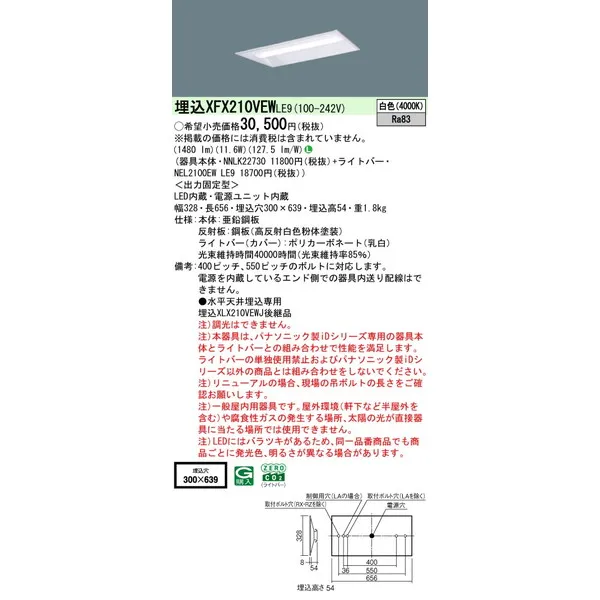 パナソニック iDシリーズ 天井埋込型 20形 一体型LEDベースライト 下面開放型 W300 XFX210VEWLE9 白色(4000K)