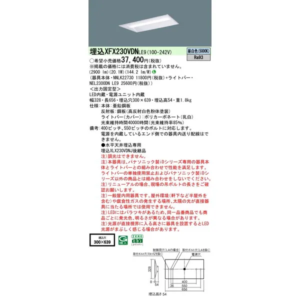 パナソニック iDシリーズ 天井埋込型 20形 一体型LEDベースライト 下面開放型 W300 XFX230VDNLE9 昼白色(5000K)