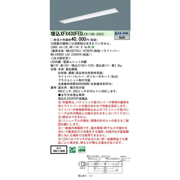 パナソニック iDシリーズ 天井埋込型 40形 一体型LEDベースライト フリーコンフォート W150 XFX430FEDLE9 昼光色(6500K)