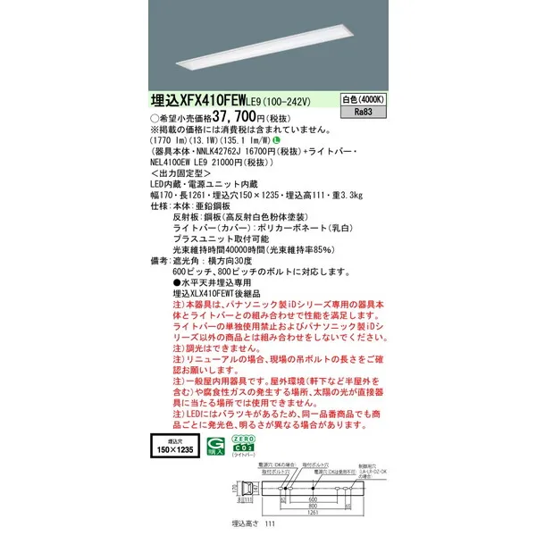 パナソニック iDシリーズ 天井埋込型 40形 一体型LEDベースライト フリーコンフォート W150 XFX410FEWLE9 白色(4000K)
