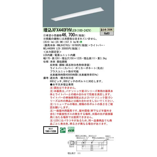 パナソニック iDシリーズ 天井埋込型 40形 一体型LEDベースライト フリーコンフォート W150 XFX440FHVLE9 温白色(3500K)