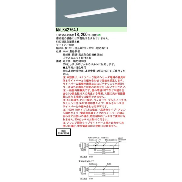 パナソニック iDシリーズ 天井埋込型 40形 一体型LEDベースライト フリーコンフォート W220 NNLK42764J+NEL4600DWLE9 白色(4000K)