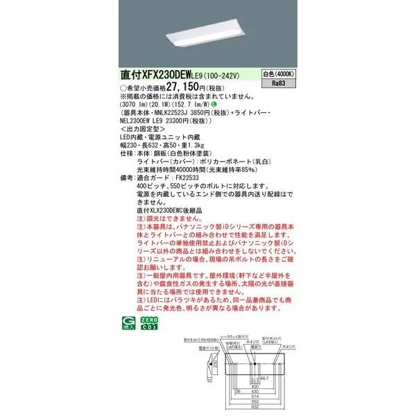 パナソニック iDシリーズ 天井直付型 20形 一体型LEDベースライト Dスタイル W230 富士型 XFX230DEWLE9 白色(4000K)