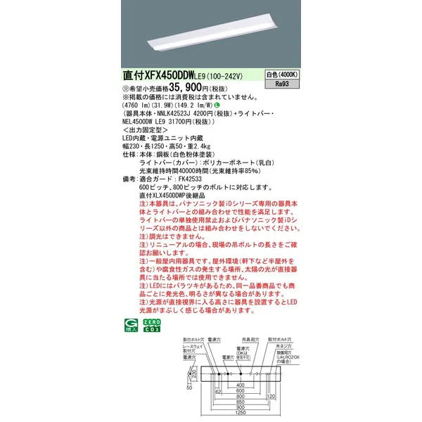 パナソニック iDシリーズ 天井直付型 40形 一体型LEDベースライト Dスタイル W230 富士型 XFX450DDWLE9 昼白色(5000K)