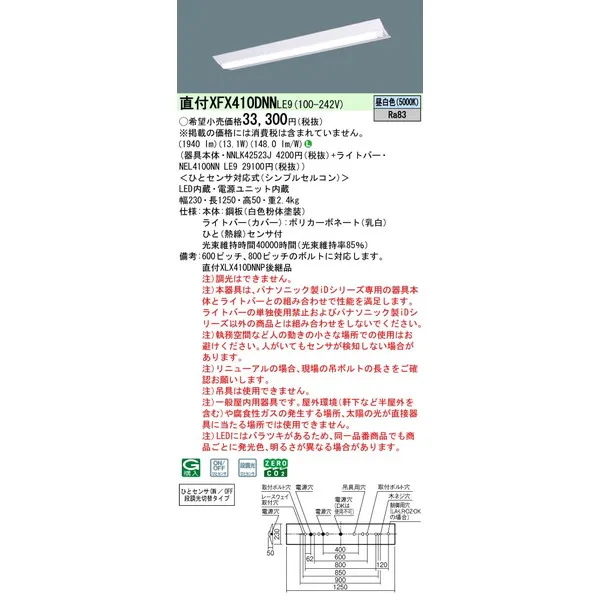 パナソニック iDシリーズ 天井直付型 40形 一体型LEDベースライト Dスタイル W230 富士型 XFX410DNNLE9 昼光色(6500K)