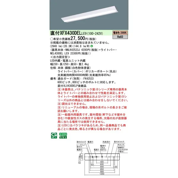 パナソニック iDシリーズ 天井直付型 40形 一体型LEDベースライト Dスタイル W230 富士型 XFX430DELLE9 温白色(3500K)